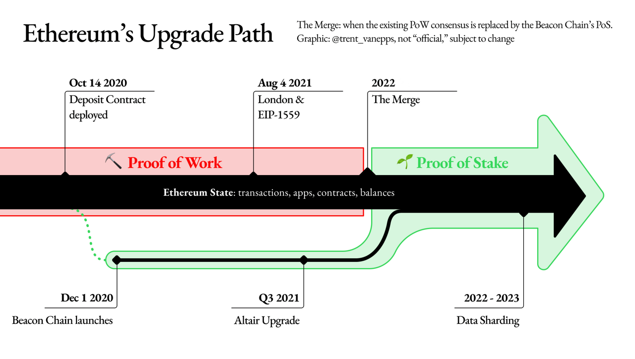 이더리움은 2015년 네트워크 출시부터 작업증명방식(Proof of Work, PoW)을 합의 알고리즘으로 사용했습니다. 하지만 이더리움 디앱 생태계가 크게 확장되면서 네트워크 지연, 과도한 가스비로 인한 확장성 문제가 발생했습니다. 이를 해결하기 위해 현재는 기존의 PoW 방식의 실행 레이어(Execution Layer)에 지분증명방식(Proof of Stake, PoS)을 사용하는 컨센서스 레이어(Consesnsus Layer)와 병합하는 네트워크 업그레이트 프로젝트를 진행하고 있습니다.