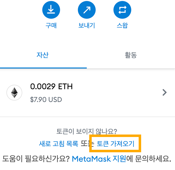메타마스크 기본창의 최하단에 ‘토큰 가져오기'를 누릅니다.