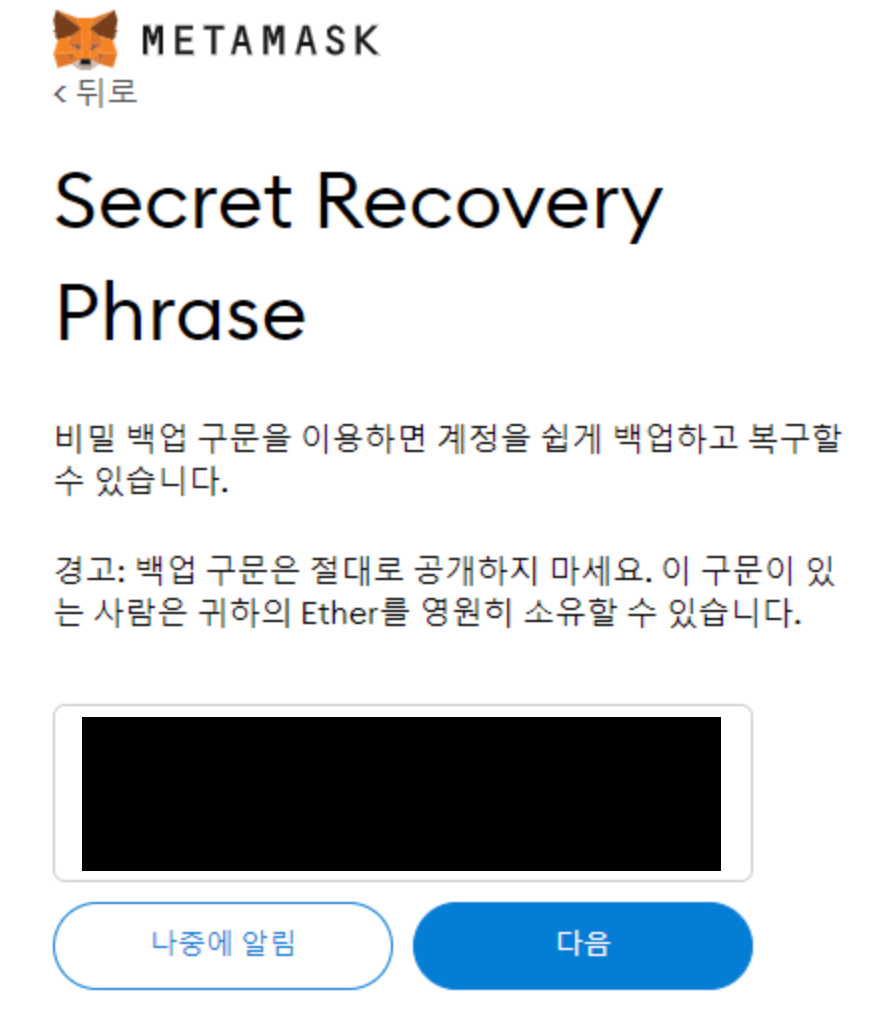 이 구문을 다른사람이 알게되면 해당 지갑에 있는 암호 자산을 탈취할 수 있습니다.