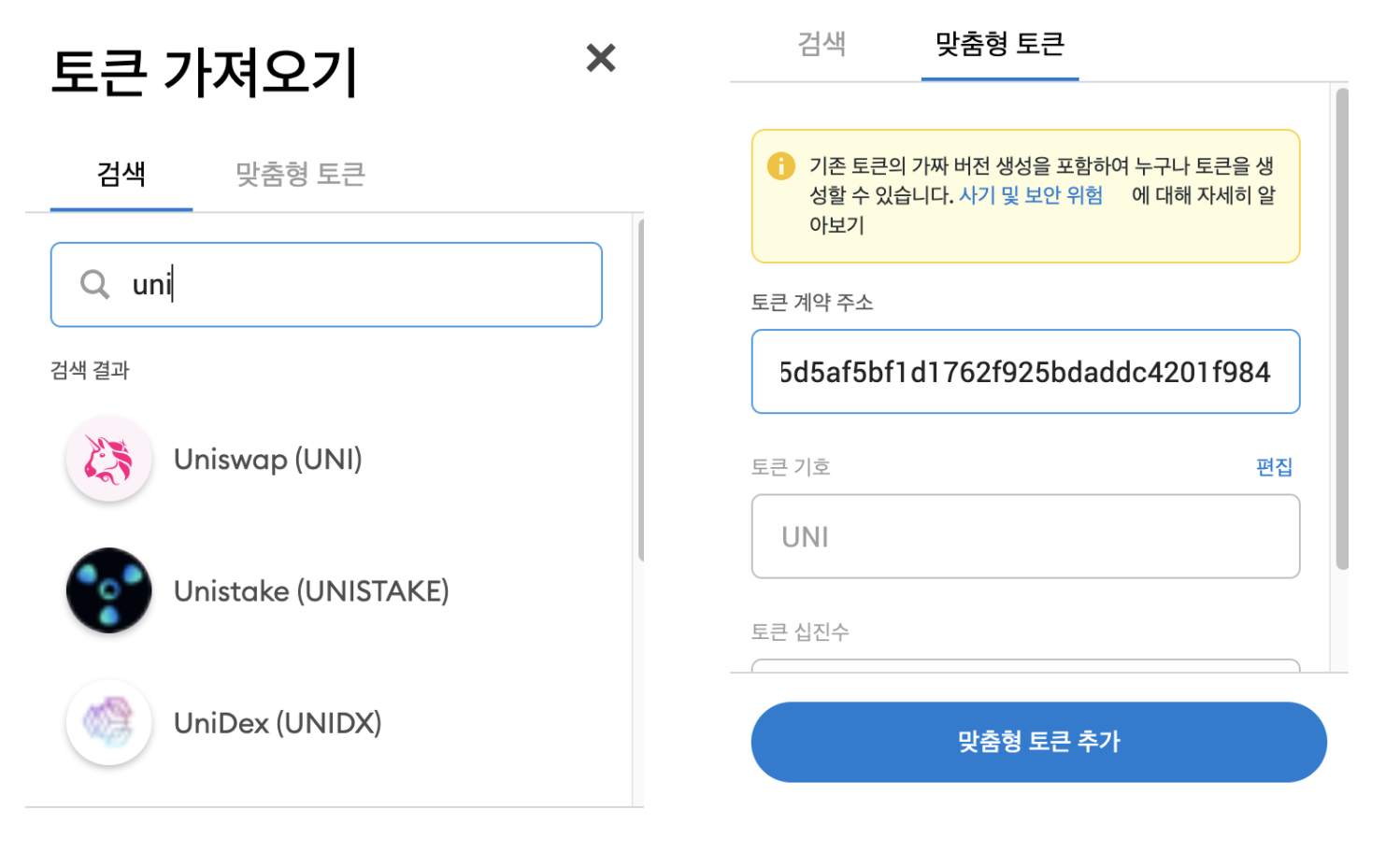 혹은 상단 탭의 ‘맞춤형 토큰’을 선택하고 직접 토큰의 스마트컨트랙트 주소를 입력하여 추가 할 수 도 있습니다.