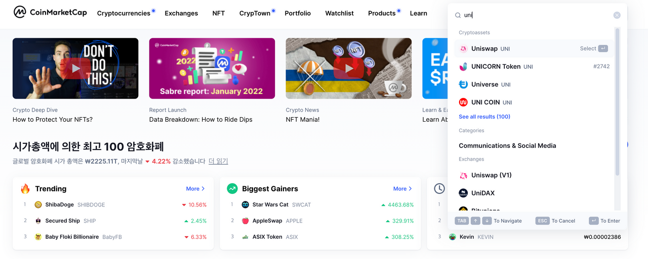 https://coinmarketcap.com에 접속하여 우측 상단에서 추가하려는 토큰을 검색합니다.