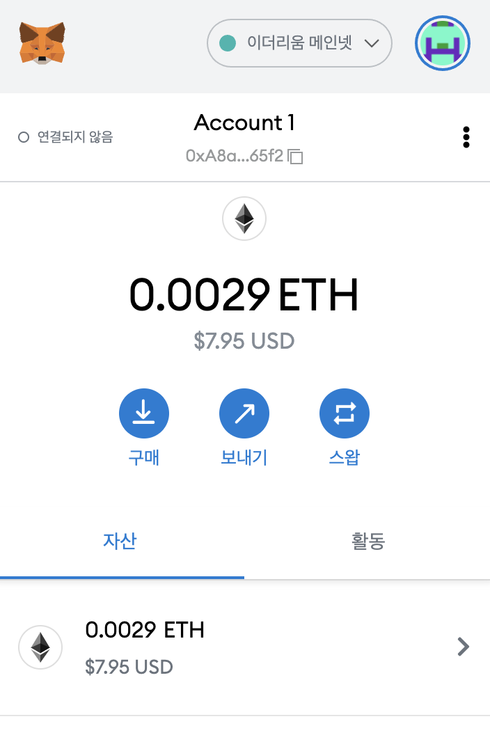바로 아래의 ETH는 현재 계정이 소유하고 있는 이더리움의 수량을 나타냅니다.