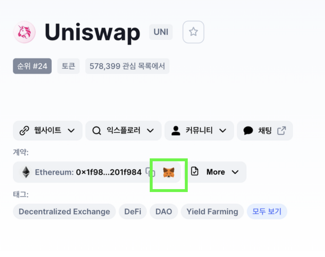검색한 토큰 명칭 하단에서 메타마스크 아이콘을 발견할 수 있습니다.
