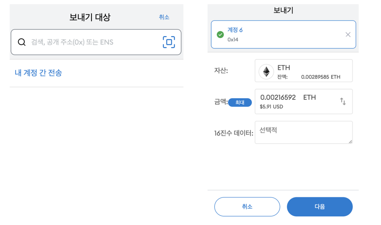 보내기 대상에 수신자의 공개 주소(공개키)를 입력하고 금액에 보낼 이더리움의 수량을 입력하여 이더리움을 전송할 수 있습니다.