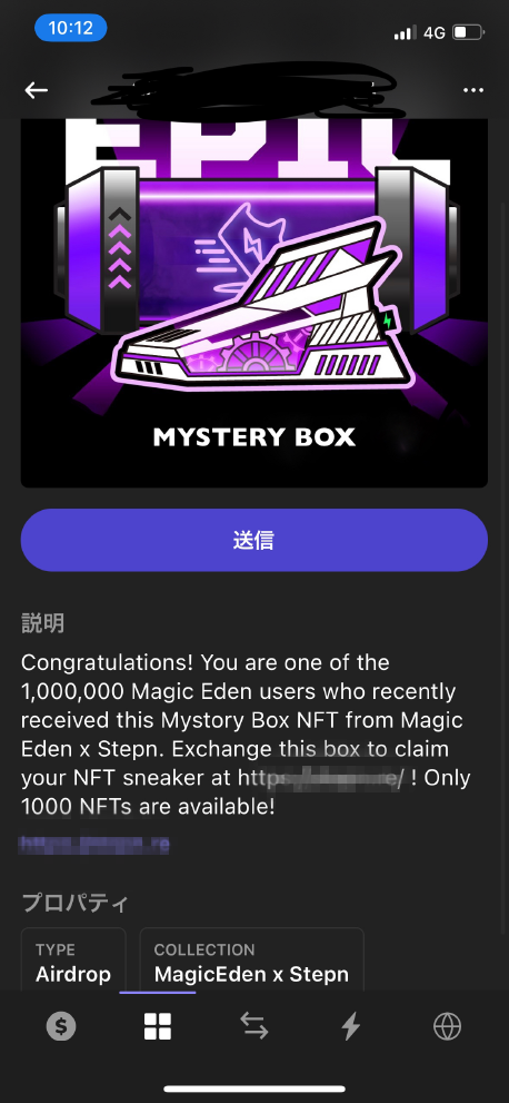 위 이미지의 NFT에 포함된 내용은 "미스테리 박스(일종의 랜덤박스)당첨을 축하한다. 100만명이 당첨 됐는데, 내가 안내해주는 사이트에 접속하면 선착순 1000명에 한해서 이 NFT 미스테리 박스와 NFT를 교환하여 지급한다"라는 내용입니다.