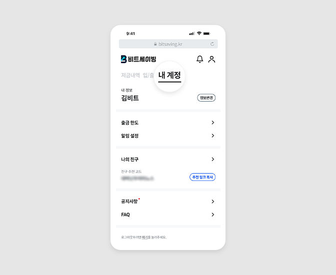 저금 관련 사항은 ‘저금내역’에서 확인하고, 비트세이빙에 보관중인 자산은 ‘입/출금’에서 확인하세요.