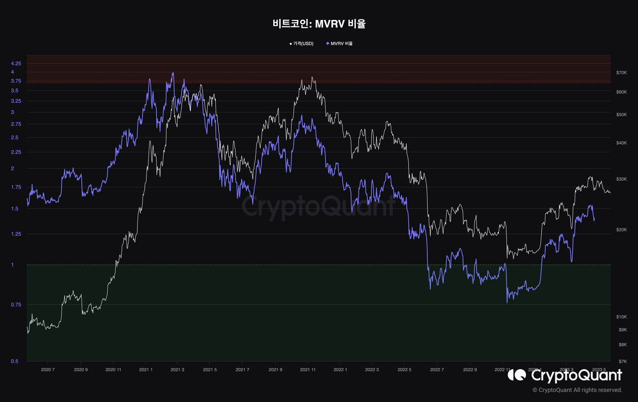 주식을 예로 들어, 현재 주가가 평균 매수가보다 아래면 저평가되었다고 말하듯이 비트코인도 마찬가지로 MVRV 1을 기준으로, 1 이하면 저평가, 1 이상이면 고평가 구간이라고 해석합니다.